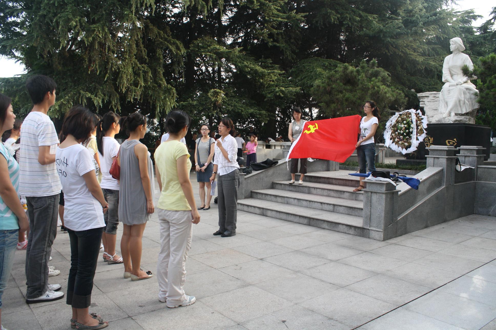 7月1日早上6:00,两系的老师带领同学们从公司坐车前往龟山。一路上同学们心情都非常激动,因为这是第一次到校外进行如此有意义的宣誓活动。到达向警予烈士墓后,大家自觉列队站好,每人手持一朵白花,老党员给新党员佩戴党徽。随后新党员在外语系金巍书记的带领下,面向鲜艳的党旗,庄严地进行宣誓。宣誓结束后,大家依次将手中的白花系在烈士墓两旁的松树上,向革命先辈表达了无限的敬意。