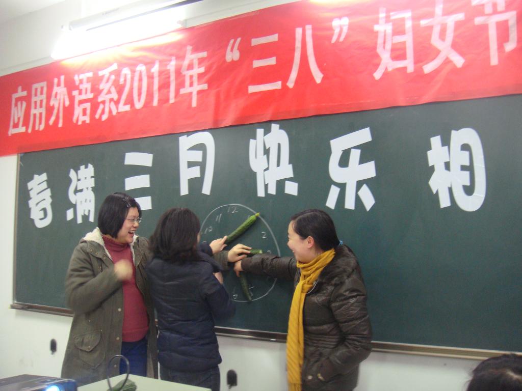 春暖花开,煦日融融,昨日,“应用外语系三八节活动”在一片欢声笑语中拉开帷幕,平日书声琅琅的210语音室变成了老师们欢聚一堂的胜地,桌上的零食、水果,黑板上的大红横幅,墙壁上的生动投影,无不透露出活动组织者们的专心和细心,让人觉得温馨又贴心。