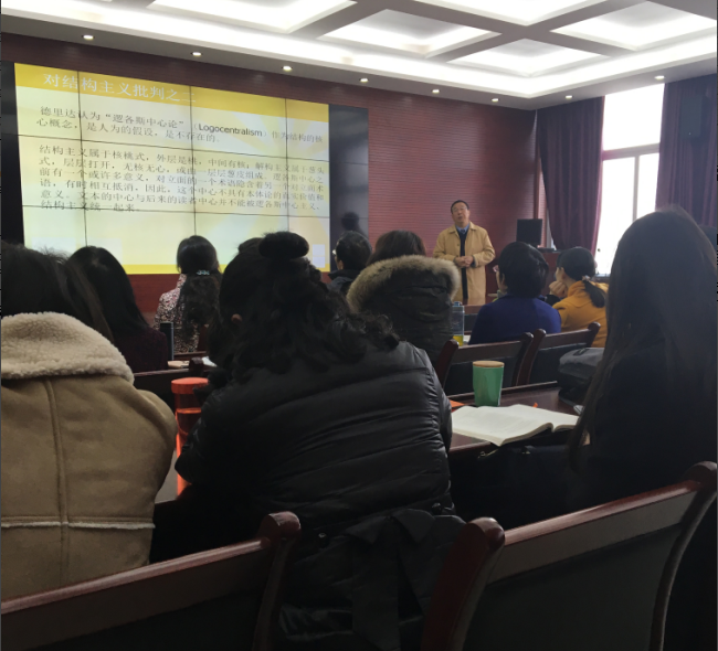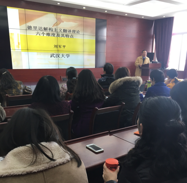 本次讲座的主题为“德里达解构主义翻译理论的六个维度及其特点”。在讲座中,刘教授系统地介绍了德里达解构主义的翻译思想,对其核心概念如延异、踪迹、可重复性、确切翻译作了细致的分析和阐述,说明了德里达的翻译理论不仅是形而上的构建,也可运用到翻译实践的思考。刘教授的讲座条理清晰,举例旁征博引,贯古通今,生动活泼。到场聆听讲座的外国语公司全体专任教师对德里达德翻译理论有了更深入的了解,并深受启发。讲座结束后,刘军平教授悉心解答公司教师的疑问,并与公司教师展开了热烈的讨论。