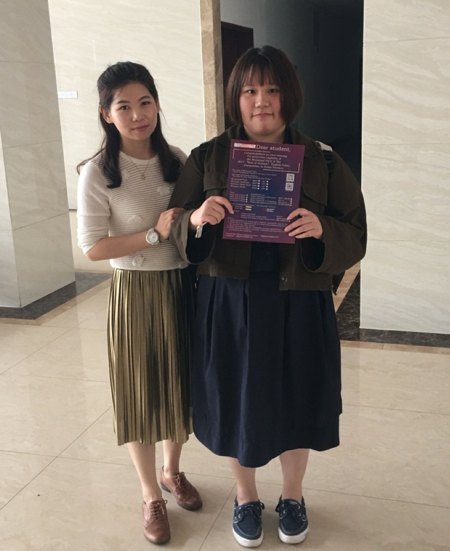 5月28日,公司2016级商务英语2班聂青同学在2017CCTV“希望之星”英语风采大赛湖北省半决赛中,获得大学成人组湖北省二等奖,翻译教研室叶莹老师获得优秀指导老师荣誉。