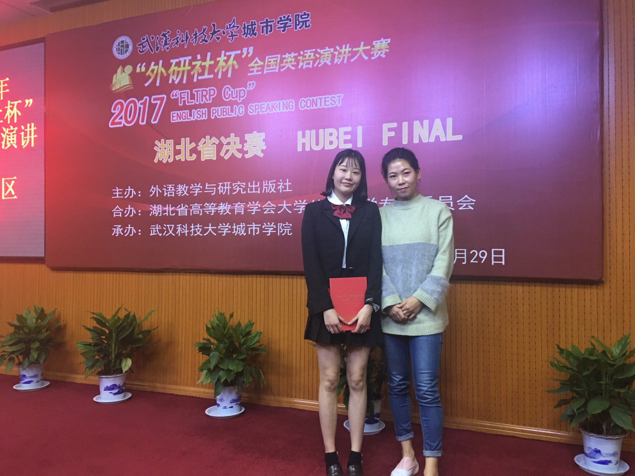 10月29日上午,2017年“外研社杯”全国英语演讲比赛湖北赛区决赛,在武汉科技大学城市公司成功举办,公司15级商务英语1班徐赵君同学喜获湖北省二等奖,翻译专业教研室叶莹老师获优秀指导教师称号。