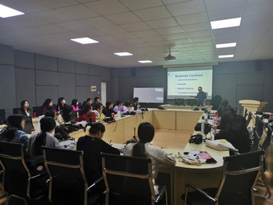 刘洋老师主讲内容为商务英语合同翻译。刘老师学识渊博,才华横溢,他由“契约精神”引入,引经据典,深入浅出,加强员工对商务合同背后文化含蕴的理解。在讲解合同文体特征时,刘老师凭借自身对中英双语精准的驾驭能力,从细微着手,深刻地剖析了词义与句法特征,以展现合同翻译的细致严谨。整节课有张有弛,有讲有练,既引人深思,又耐人寻味。此次示范课体示了刘洋老师高超的教学设计水平和扎实的专业功底,更展现了他丰富的跨学科知识和娴熟的融会贯通能力,起到了很好的示范带头作用。
