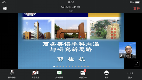 11月5日晚,外国语公司特邀广东外语外贸大学国际商务英语公司经理郭桂杭教授,做客线上“云讲堂”,为全院教师带来了题为“商务英语学科内涵与跨学科科研视角”的专题讲座。
