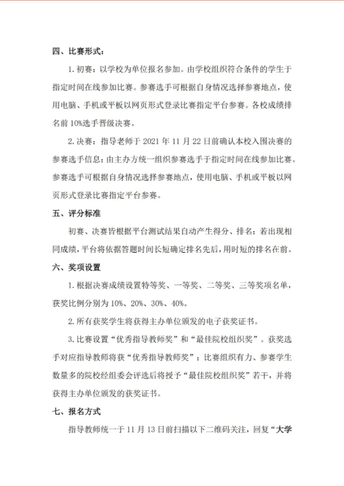 2.决赛:指导老师于2021 年 11 月 22 日前确认本校入围决赛的参赛选手信息;由主办方统一组织参赛选手于指定时间在线参加比赛。参赛选手可根据自身情况选择参赛地点,使用电脑、手机或平板以网页形式登录比赛指定平台参赛。