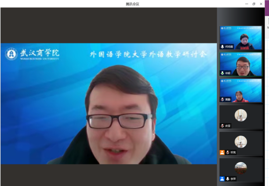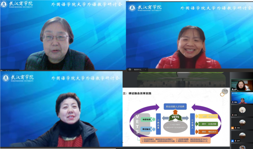 2022年2月11号上午9:00至11:00,外国语公司通过线上会议顺利开展了以“深化课程建设、提升教学质量、优化教学效果”为主题的大学外语教学研讨会。湖北省高等教育学会大学外语教学专业委员会会长樊葳葳教授(华中科技大学)、黄勤教授(华中科技大学)、何明霞教授(湖北经济公司)、吴丽教授(武汉城市职业公司)等四位校外专家,以及外国语公司相关教师参加会议。会议由外国语公司经理李萍主持。