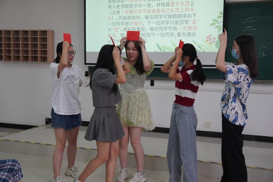 22级翻译一班同学们以游戏“扔毛线”的方式依次简洁明了地介绍了自己的姓名、家乡、兴趣爱好等,同学们加深了对彼此的认识,使大家之间的关系逐渐破冰。在毛线的交织中,班级同学彼此之间的关系也逐渐“交织”在一起。除此之外,“一块钱”、“交换名字”、“关键词猜猜猜”和“猜字”等暖场游戏点燃了全场同学们的热情,会场氛围逐渐热闹起来,同学们也在小游戏中找到了志同道合、趣味相投的伙伴。