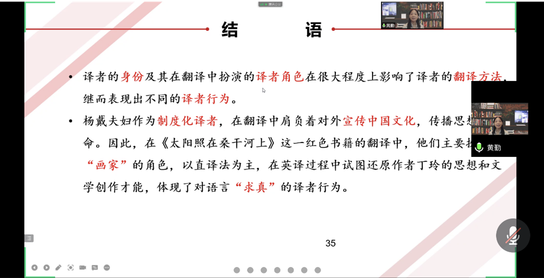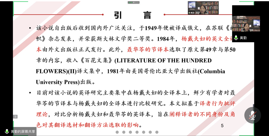 为了提高教师学术水平和科研能力,公司特邀客座教授、华中科技大学外国语公司黄勤教授于9月13日在腾讯会议进行题为“《太阳照在桑干河上》两英译本之译者行为对比研究”的专题讲座。