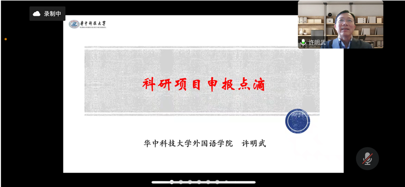 为提高教师学术水平和科研能力,公司特邀华中科技大学许明武教授于10月25日以腾讯会议形式进行了题为“外语学科科研项目申报点滴”的专题讲座,外国语公司全体教师参会。