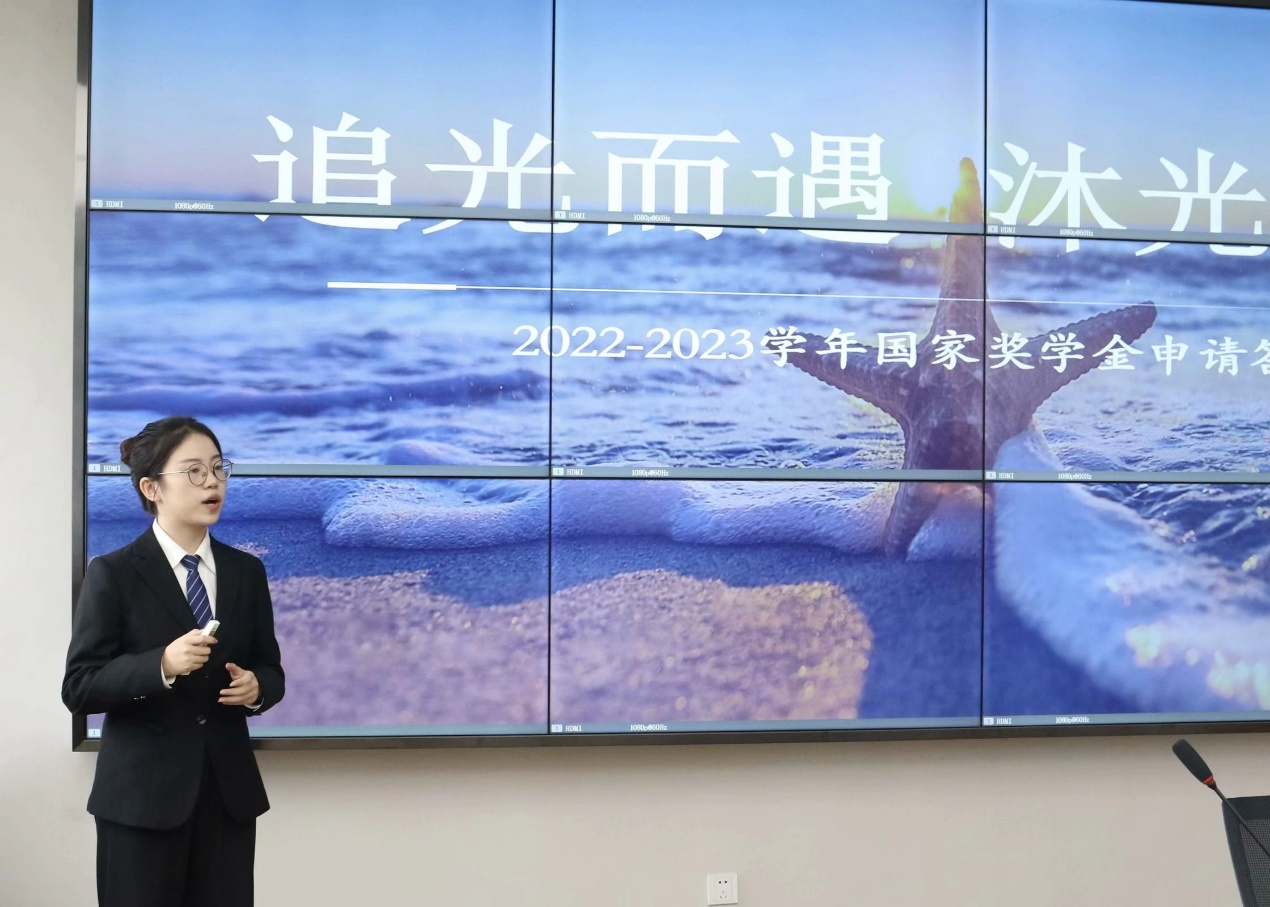 正式开始前,陈瑞雯老师对国家奖学金评判的标准进行了解读,保证了评选的公正细致。评审期间,五位秀出班行的同学以“选择所热爱,热爱所选择”“求是之道”等主题进行答辩,言辞清晰,落落大方,展现了外国语公司员工们怀珠抱玉,才学兼优的珍贵品质。