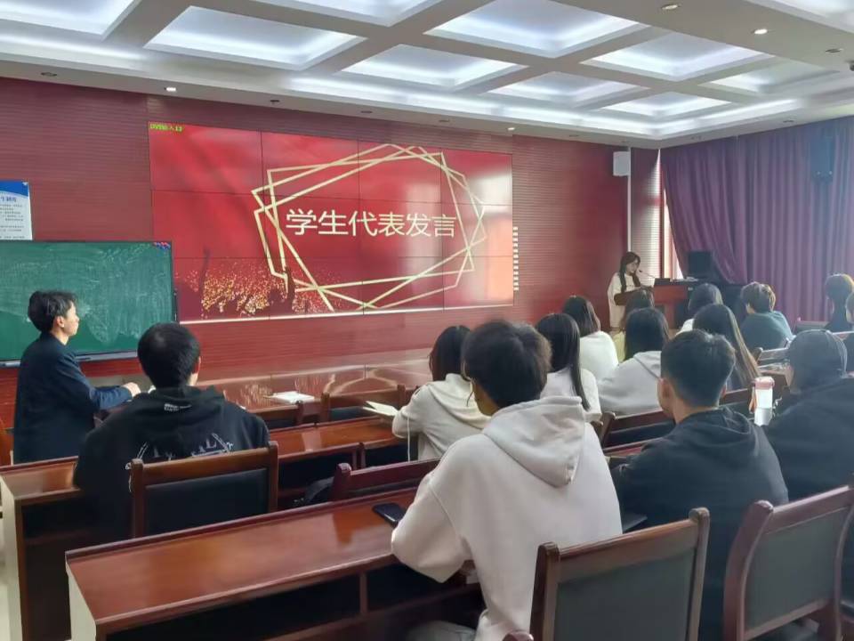 随后22级翻译一班魏家梦作学员代表发言。魏家梦同学表示作为一名入党积极分子,我们要保持蓬勃向上,意气风发的精神,紧密团结在党的周围,向党组织靠拢。以党的信念作为我们的思想明灯,以党的原则作为我们的行为准则,努力克服自己的缺点,加强理论学习和专业素质的培养,做永远跟着党走的新青年!