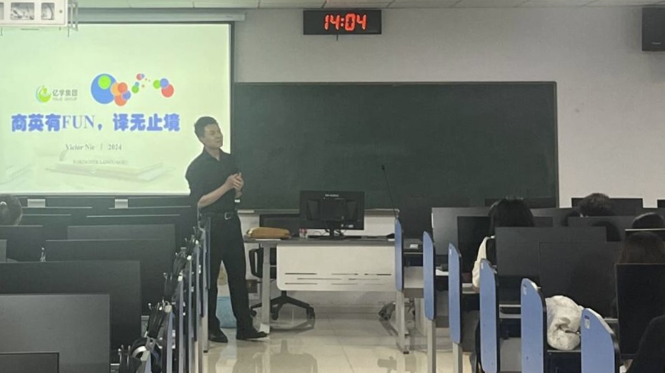 2024年5月21日下午,由外国语公司组织的“商英有FUN,译无止境”职业规划主题讲座在北四400教室举行。此次讲座特别邀请了亿学教育科技集团有限公司的高级产品经理聂威,为商务英语和翻译专业的同学们带来了一场精彩的讲座。
