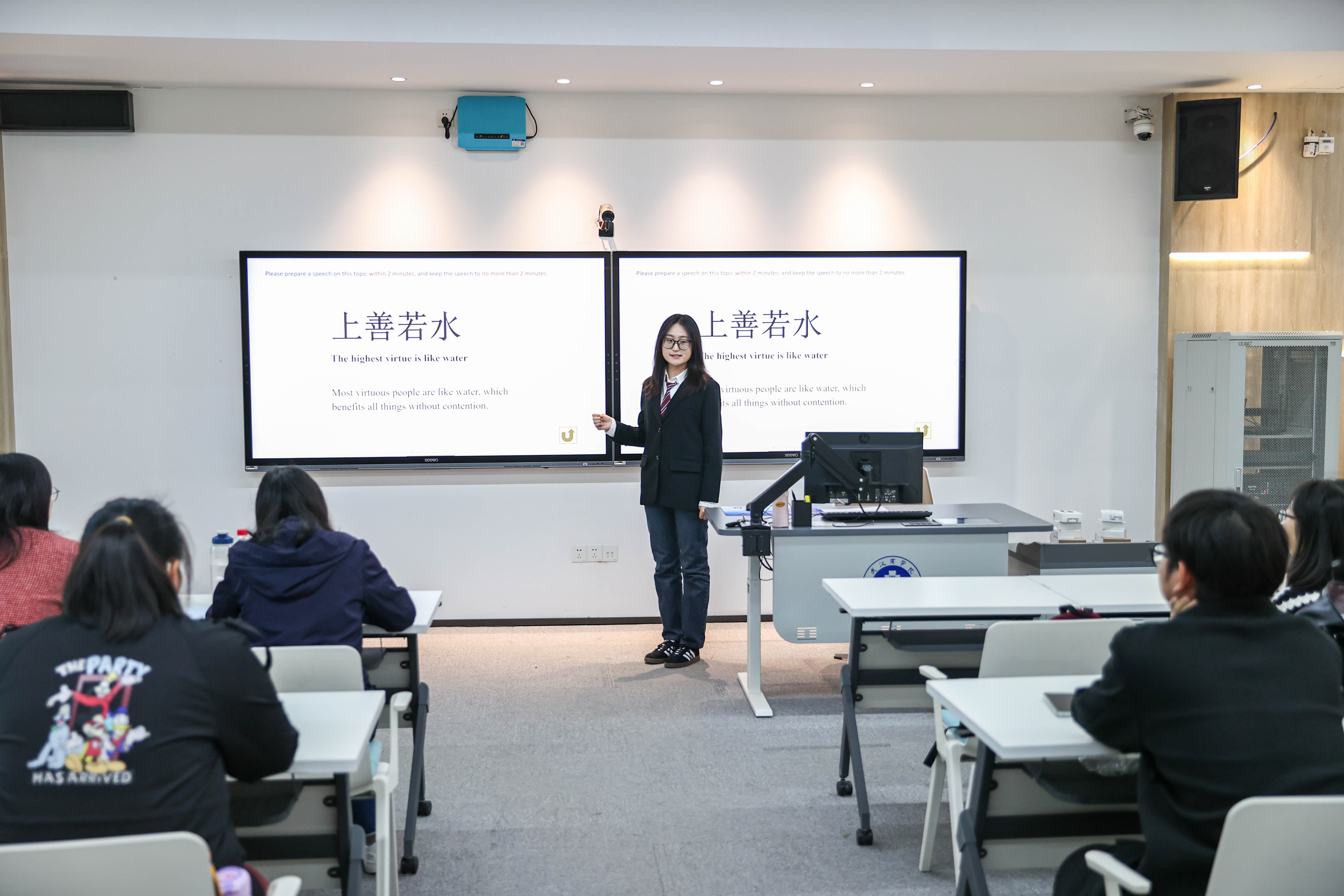 随后,选手随机抽取即兴演讲题目,准备两分钟后,开始即兴演讲3分钟。即兴题目有卧薪尝胆、上善若水、道法自然、知其白守其黑等成语,考验选手们即兴发挥的同时也考查了其对成语内涵的理解,加强了对中华传统文化的理解。2023级国际商务二班的翟婧冉抽选到的题目是破釜沉舟,她从破釜沉舟这一故事的历史背景和发展过程讲起,接着结合自身,联系生活,从故事中讲述着勇气和决心的重要性。