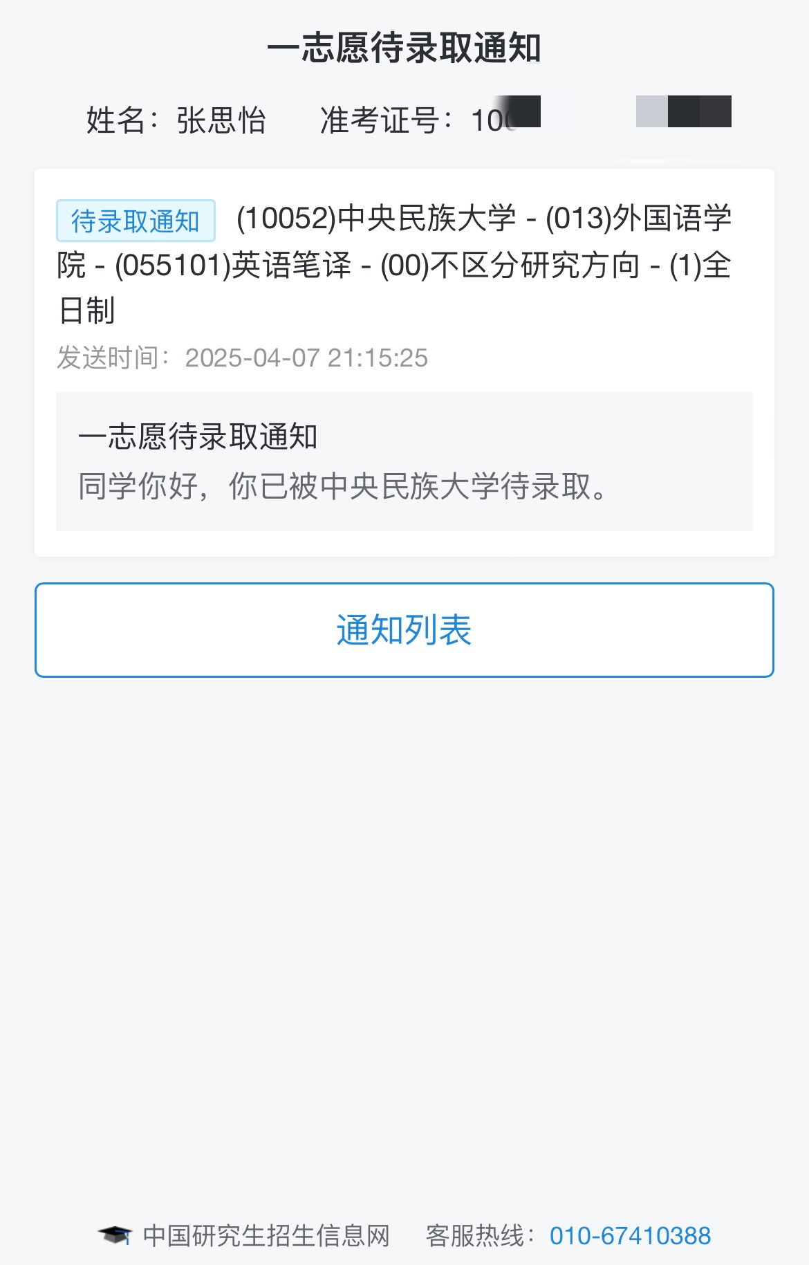 张思怡录取信息。本人供